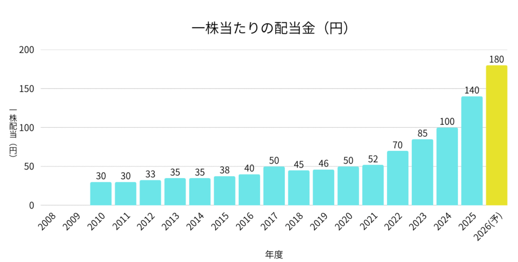一株配当金をご覧ください。2010年と比較すると2026年の予想では配当金の額はなんと6倍近くに成長していることが分かります。見事な増配トレンドですね。