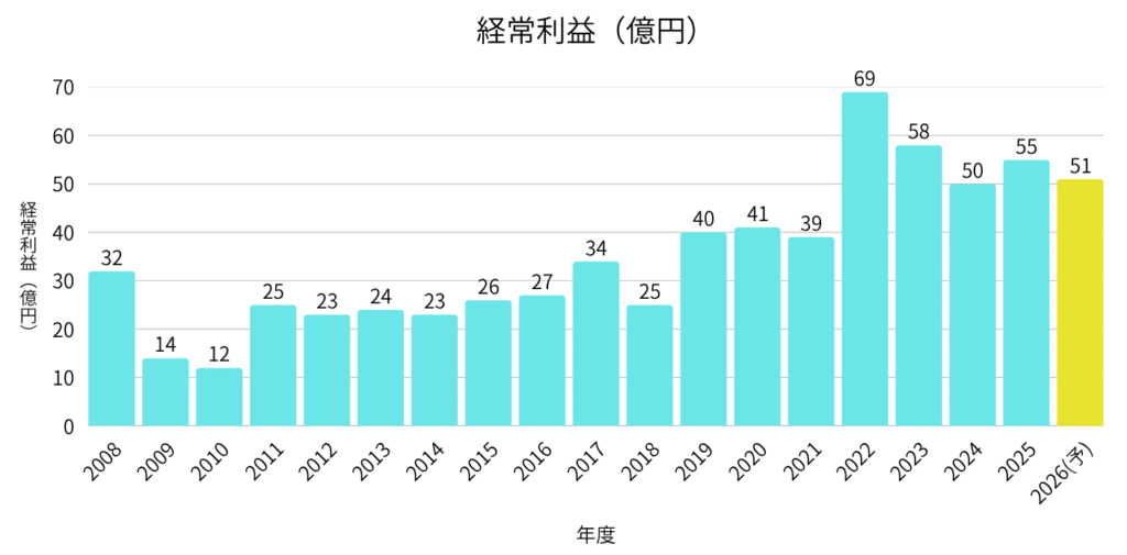 会社全体の総合的な稼ぐ力を示す経常利益(本業の利益に、投資や利息などの本業以外の損益を加えたもの)を見ていきましょう。